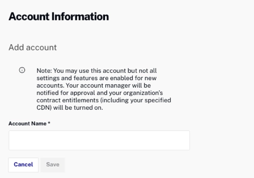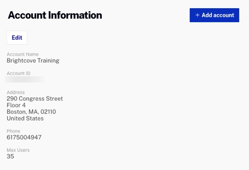 If your account is enabled for account cloning, a Create New Account button will appear. The account cloning feature can be used to create new accounts. When a new account is created, Brightcove Support will be notified and then work with your Customer Success Manager to verify the new account (based on your contract). Once verified, the account will be configured with the features outlined in your contract. When the account is fully configured, you will be notified. While the configuration is in progress, new users can be added to the account.