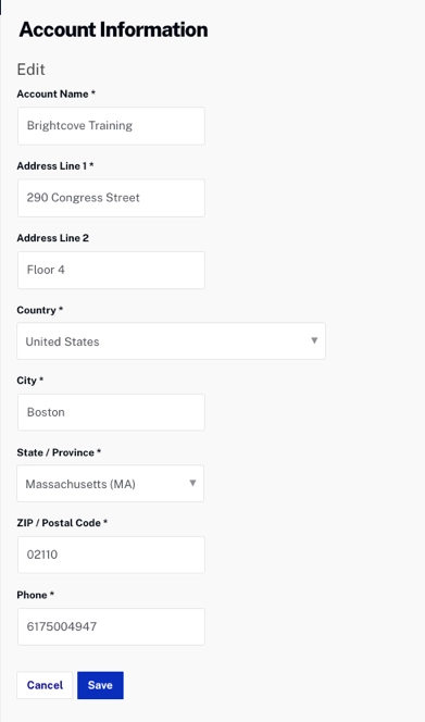 The Account Information page manages the account name and mailing address and can be used to clone accounts. Note that to access the Account Administration page, you must be a user with the Administrator role.