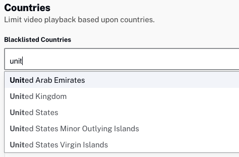 - Select the countries that will be prevented (blacklisted) or allowed (whitelisted) to view. As you type, the selection list will be filtered.