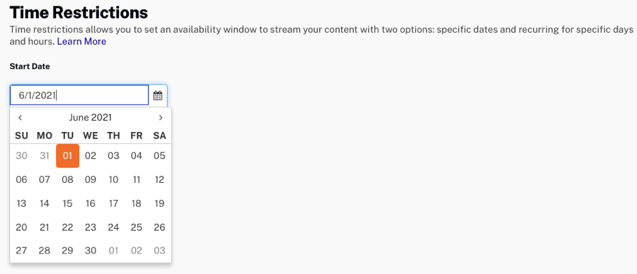 Time restrictions allow you to limit video playback based upon a specified start date. To assign time restrictions to a playback right, follow these steps: