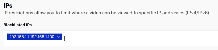 - Enter a range of IP addresses that will be prevented (blacklisted) or allowed (whitelisted) from viewing. CIDR block notation is also supported.