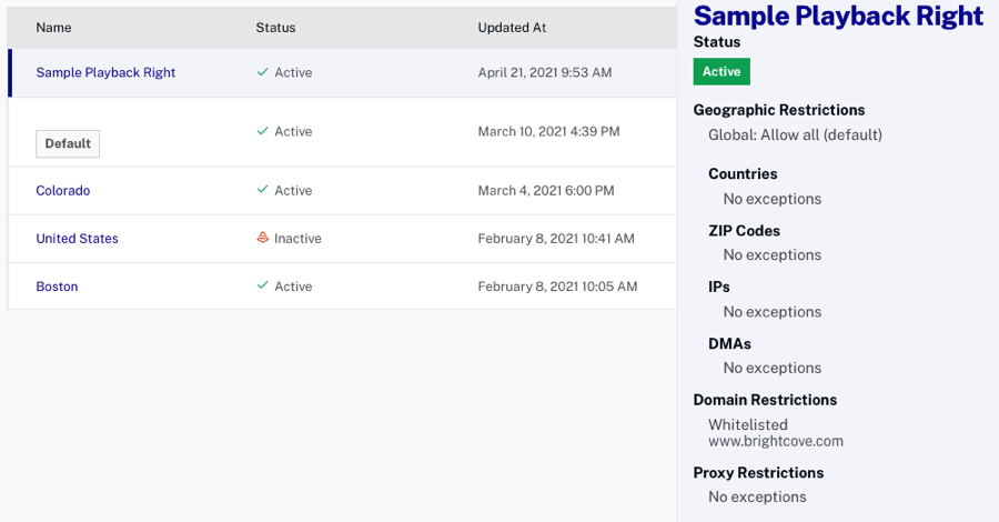 Geographic restrictions allow you to limit video playback based upon country, ZIP code, IPs and designated market area. To assign geographic restrictions to a playback right, follow these steps:
