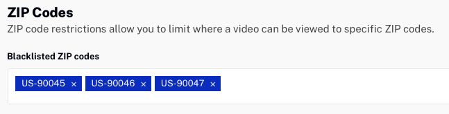 - Enter a list of zip codes that will be prevented (blacklisted) or allowed (whitelisted) from viewing. The zip codes should be prefixed with an uppercase, two letter country code and hyphen, for example, US-90045.