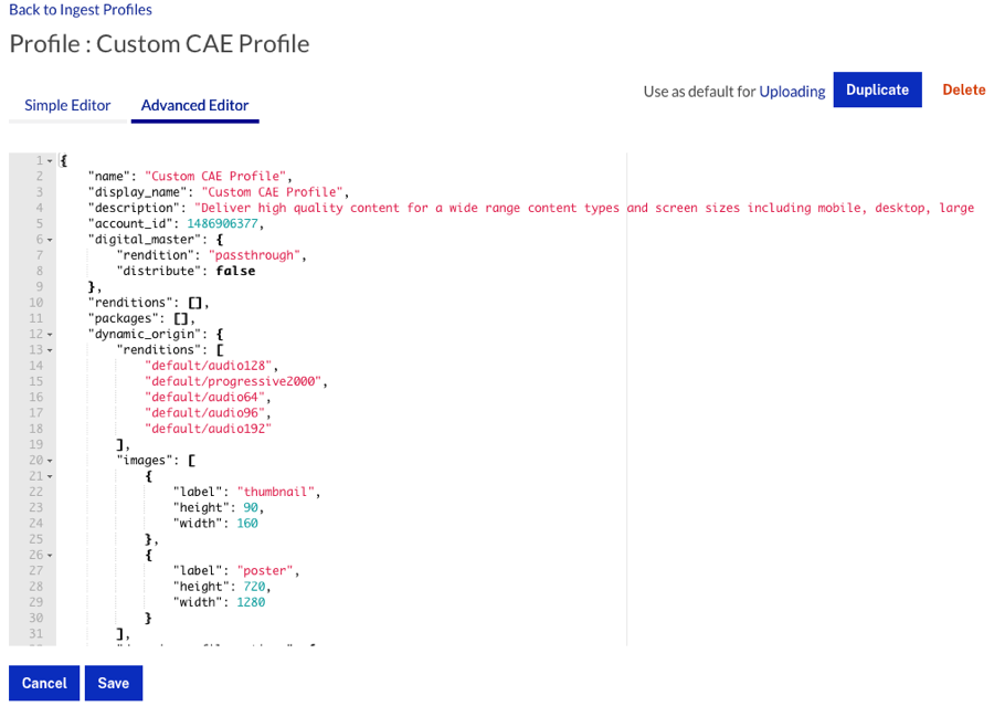 While the JSON can be edited here, Brightcove recommends editing profiles using the Simple Editor to reduce the likelihood of mistakes. For information on the available attributes, see the Ingest Profiles API Fields Reference for Dynamic Delivery and Context Aware Encoding topic.