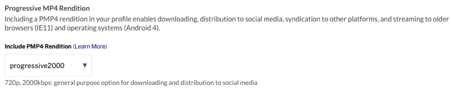 - Select a Progressive MP4 Rendition to create. At least one MP4 rendition is required to post videos to social media accounts using the Social module or to allow video downloads. Select None if an MP4 rendition should not be created.