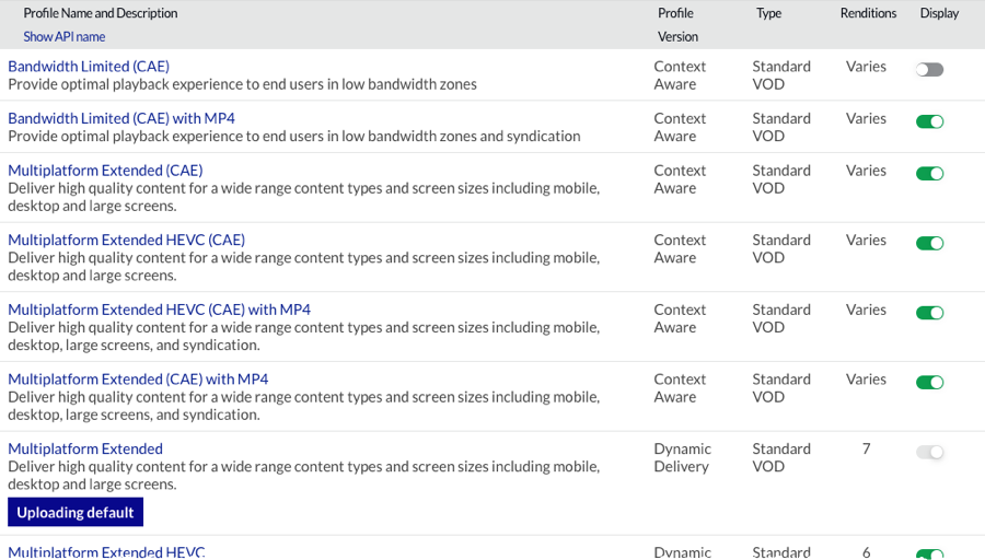 All Brightcove accounts have an uploading default ingest profile. The uploading default ingest profile is indicated with next to the profile name.