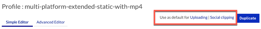 A default ingest profile can be configured for when videos are uploaded and when clipping using the Social module. The upload default profile is indicated with next to the profile name. The social clipping default profile is indicated with