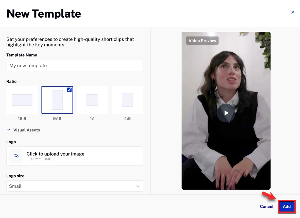 Automatic: AI selects the best layout, including split layouts for multiple speakers.Extract highlights Enabled by default. If disabled, the entire video is kept, and only reframing is applied. Processing timeframe Restricts clip generation to a specific segment of the video. Clip length Constrains the duration of generated clips. Clip focus Optional prompt describing what content should be included or excluded. Clip style Select a template. Only templates with a matching aspect ratio are shown. Default templates are always available under Quick Presets. -