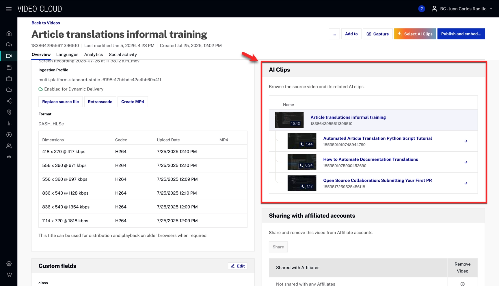 An AI Clips section appears in the Overview tab for both source videos and generated clips, allowing quick navigation between parents and clips.