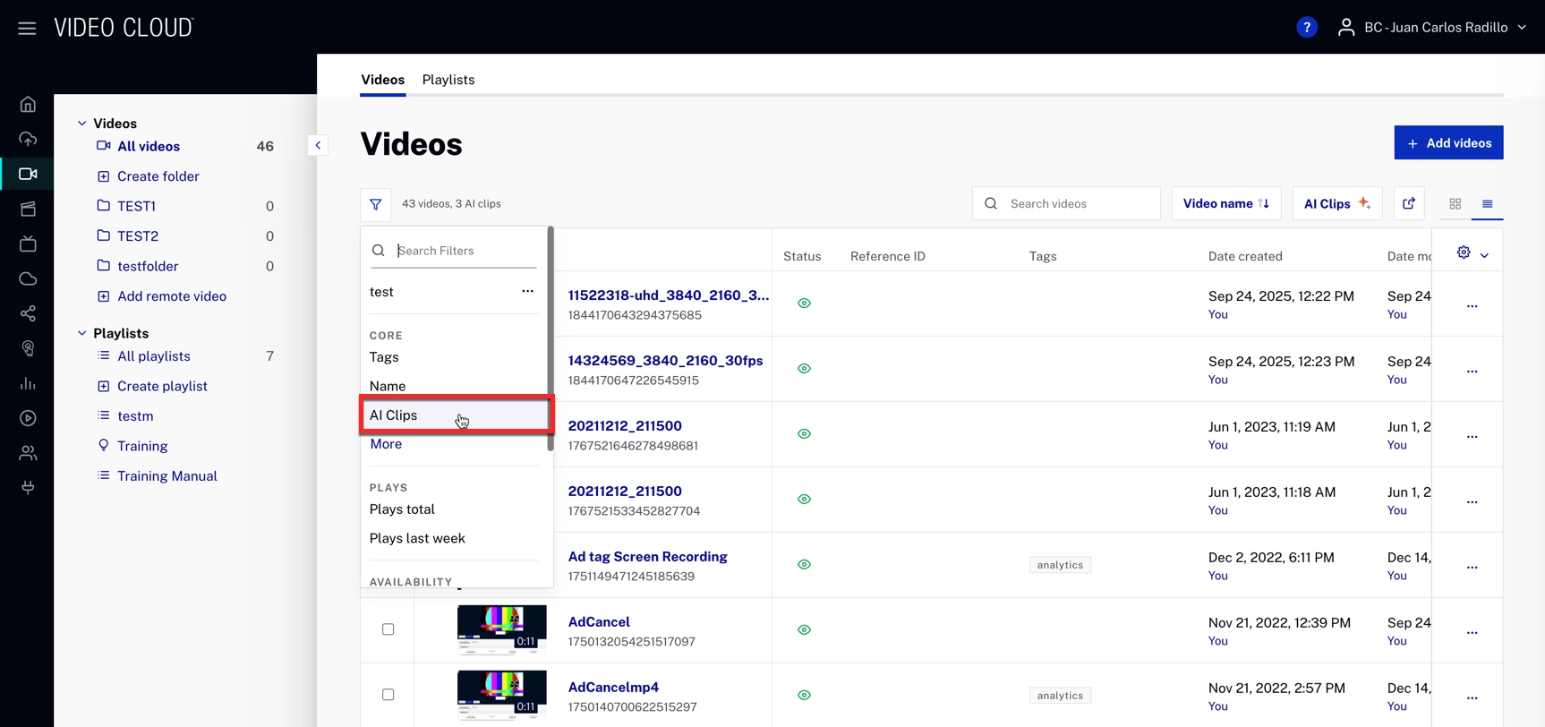 Clicking the AI Clips button above the table automatically enables the Videos with AI Clips filter.