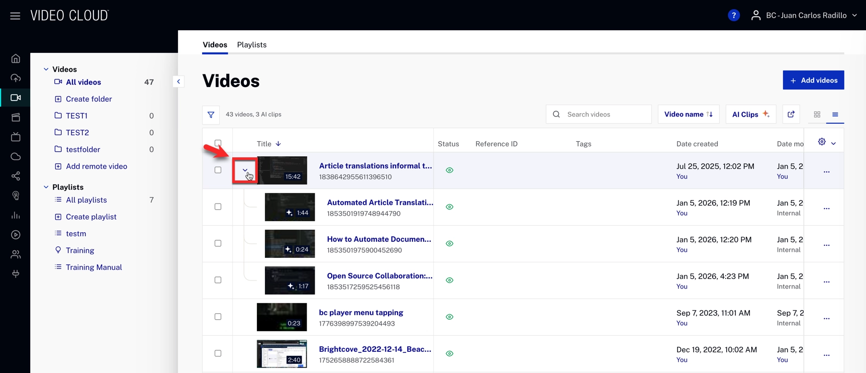 By default, ingested clips are hidden in the Media table. Videos that generated clips display an arrow next to their thumbnail, allowing you to expand and reveal associated clips.