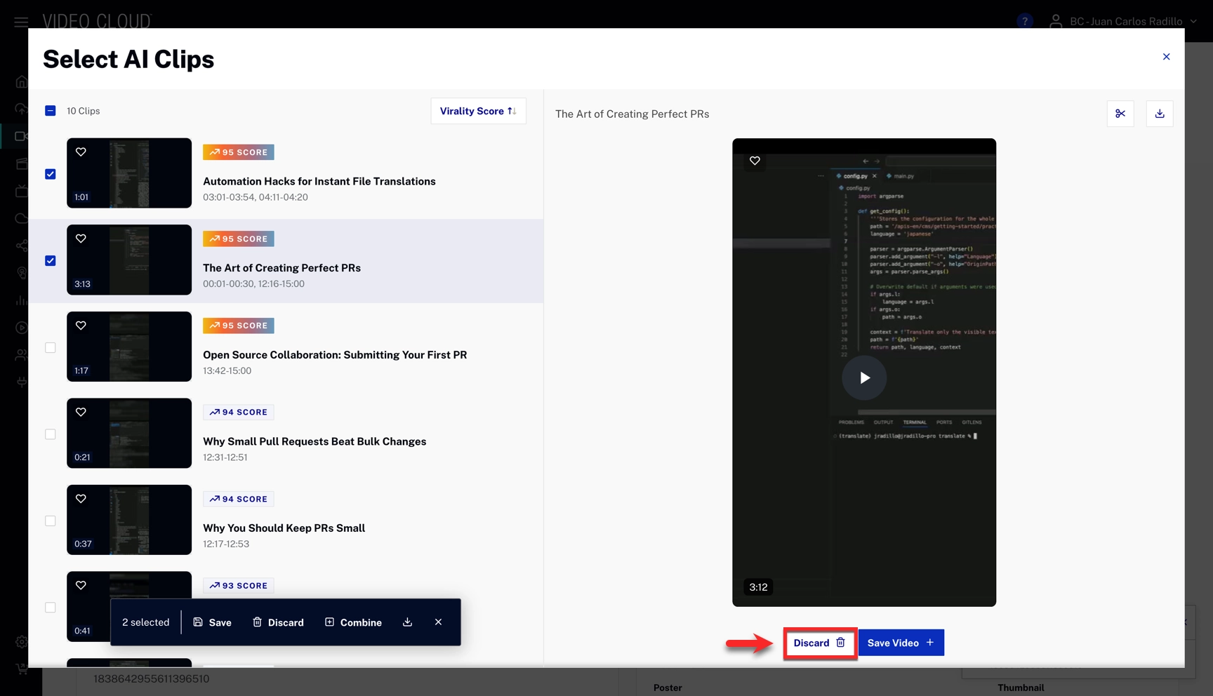 - Discard: removes the clip from the selection.