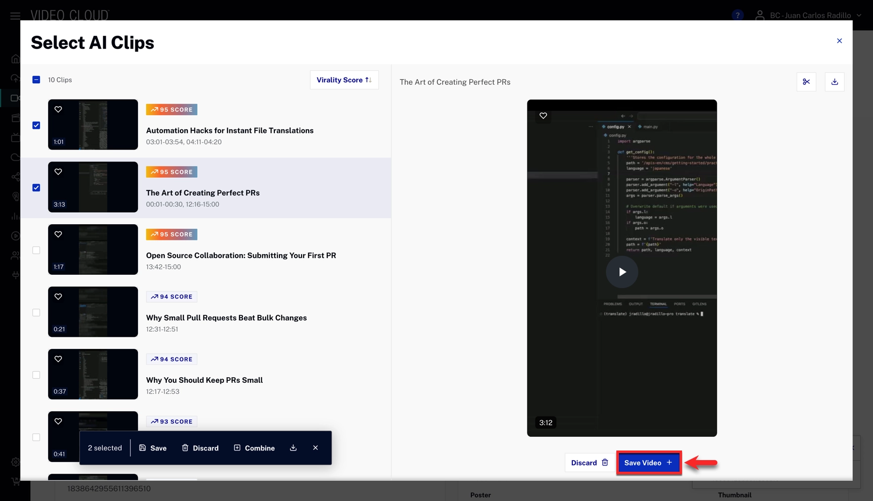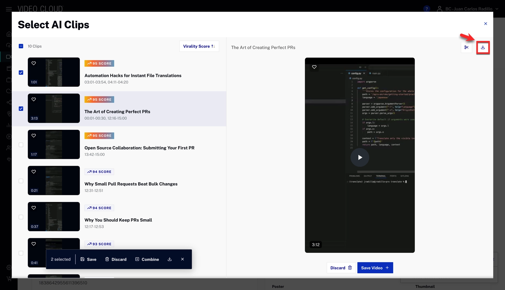 - Save Video: saves the video to your video's AI Clips section.