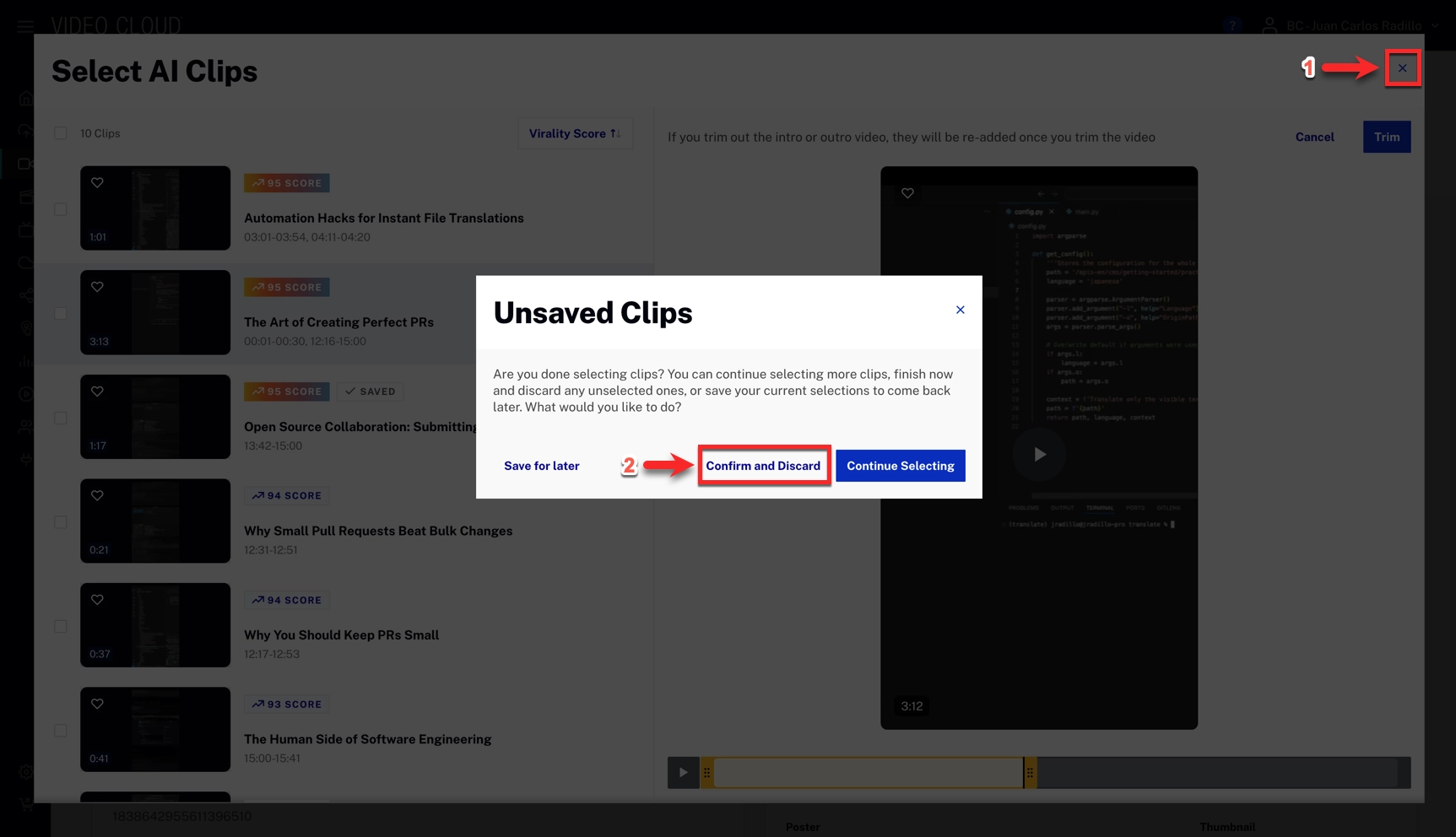 If you wish to generate more clips for a video that already has generated clips, close the Clip Selection modal and select