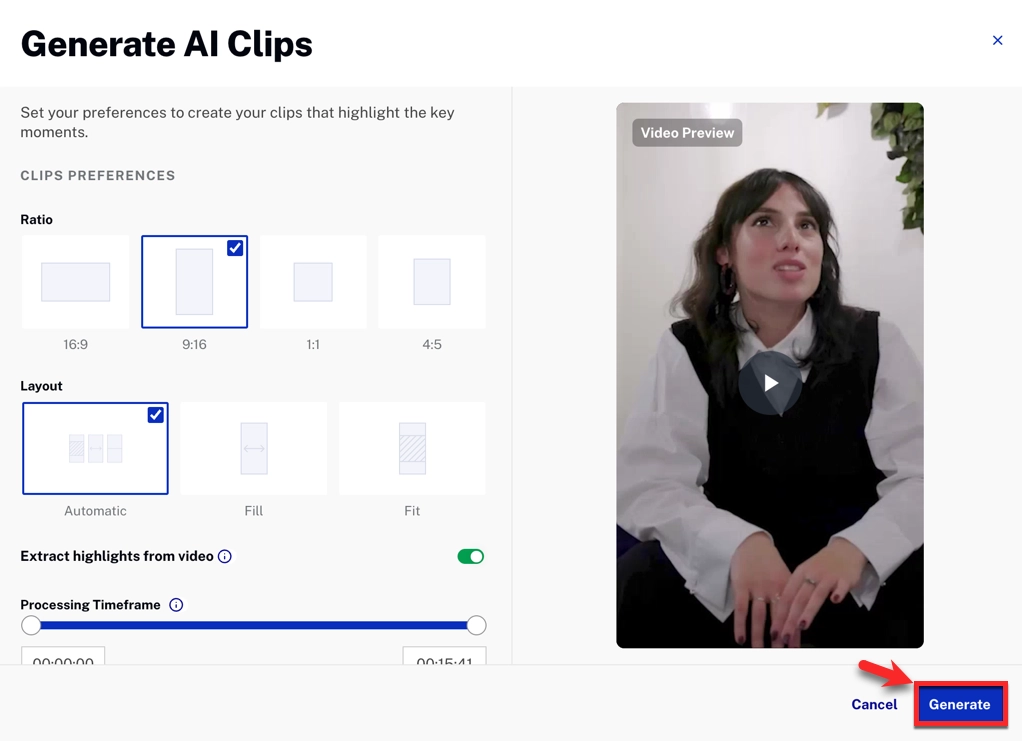 AI Clips generation options Setting Description Aspect ratio One of four available aspect ratios. Layout Fill: video may be cropped