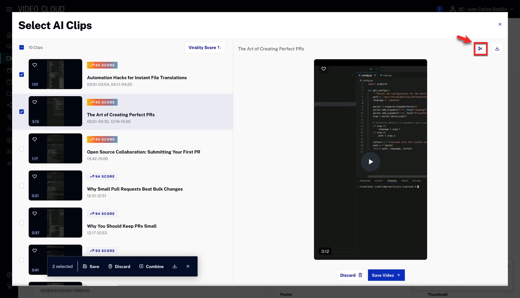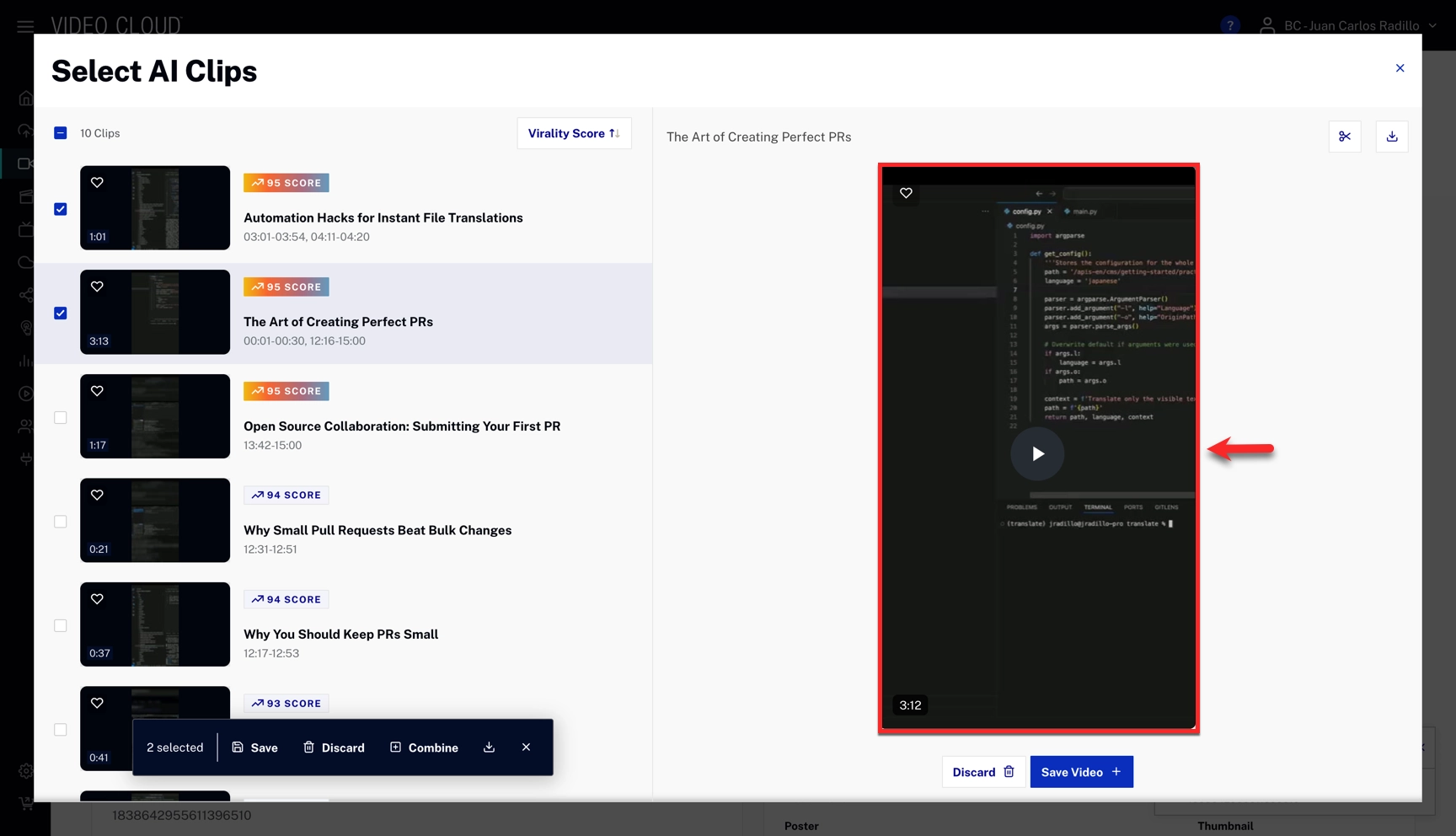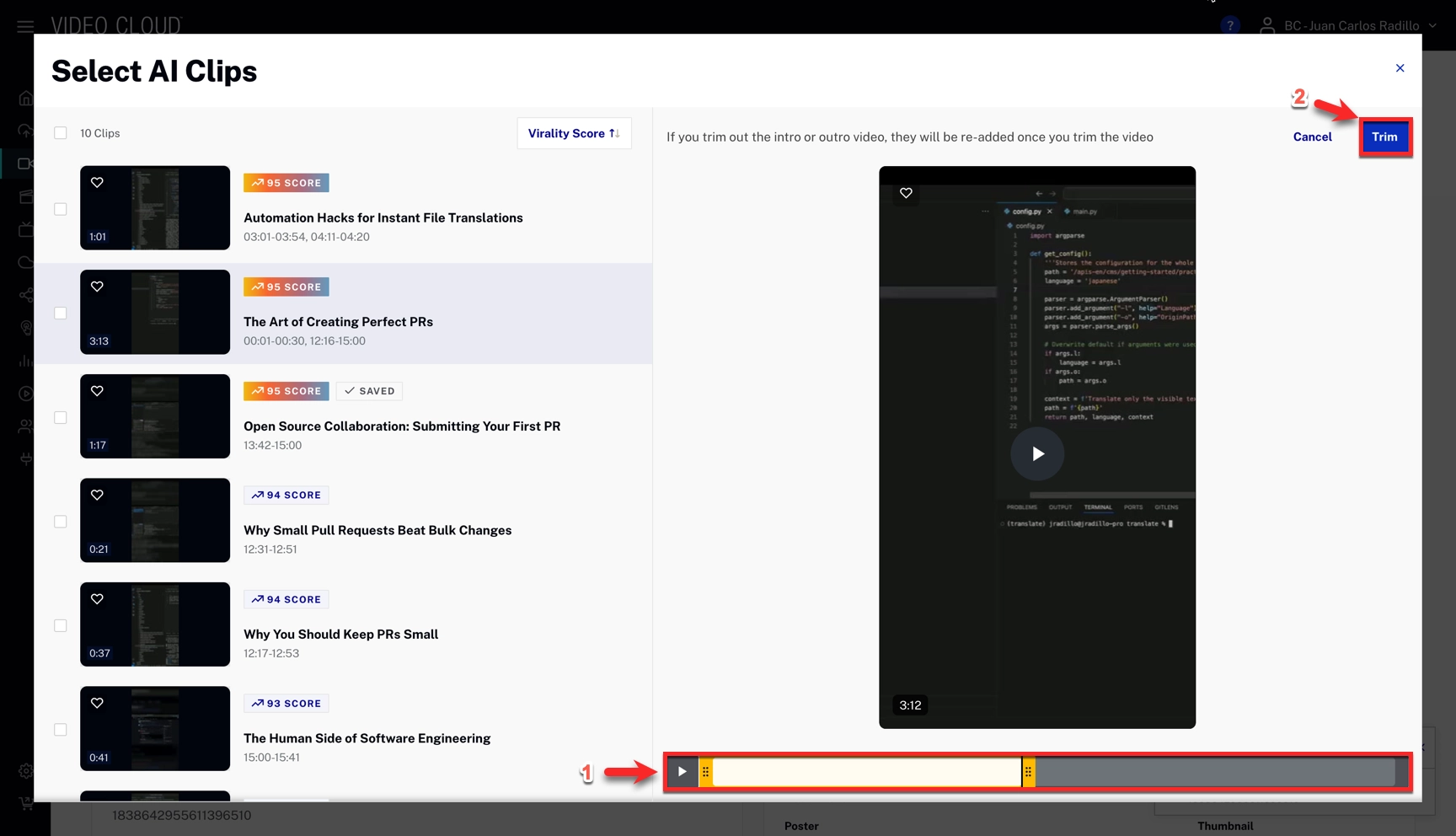 The virality score estimates how engaging a clip is based on factors such as emotional impact, trend alignment, shareability, and narrative clarity.