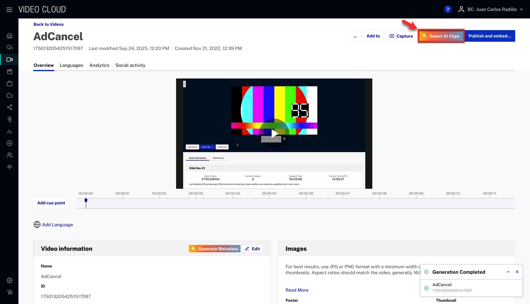 The AI Content Multiplier automatically generates short clips from a video by selecting highlights and reframing the content to a desired aspect ratio. Generated clips can be previewed, downloaded, or ingested to become full-fledged Brightcove videos.