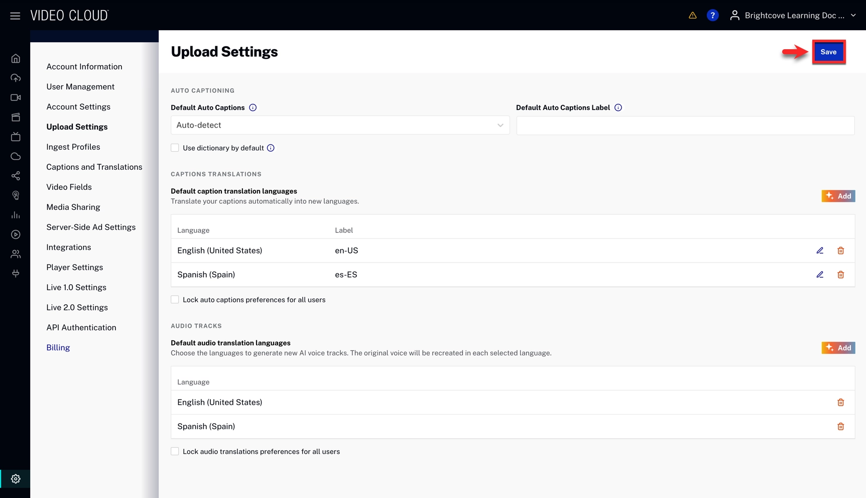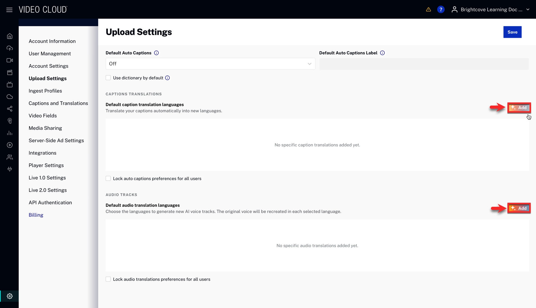 - Add the default caption and audio translation languages by clicking
