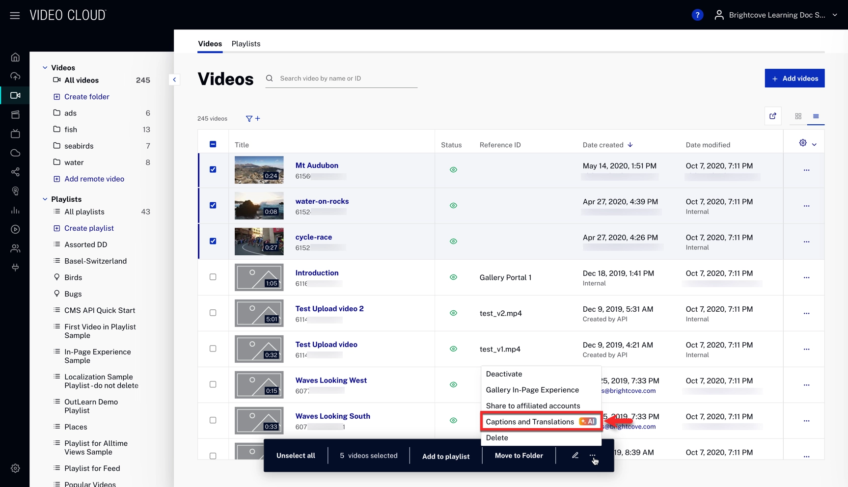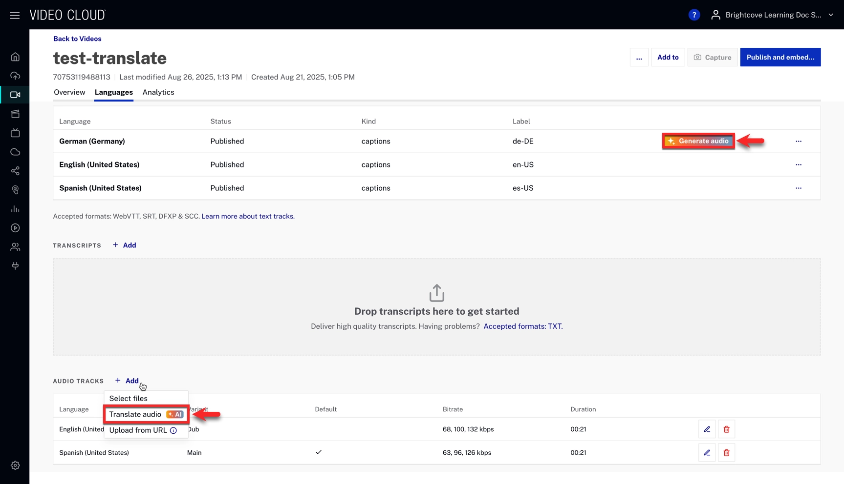 - Processing Time: Can take several minutes. When ready, captions and audio tracks will appear in the video details page.