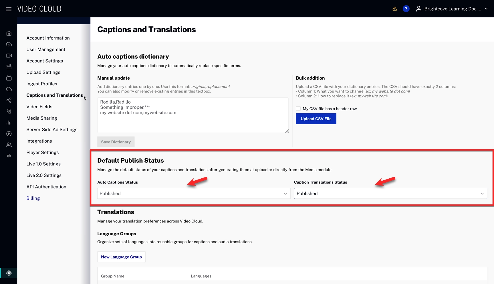 - Select Captions and Translations and scroll down to the Default Publish Status section.