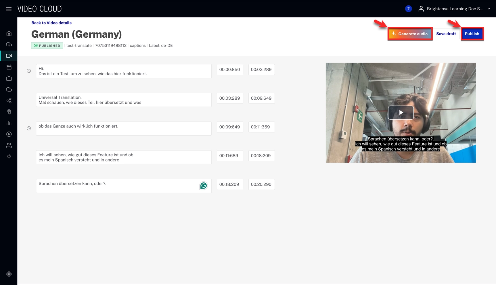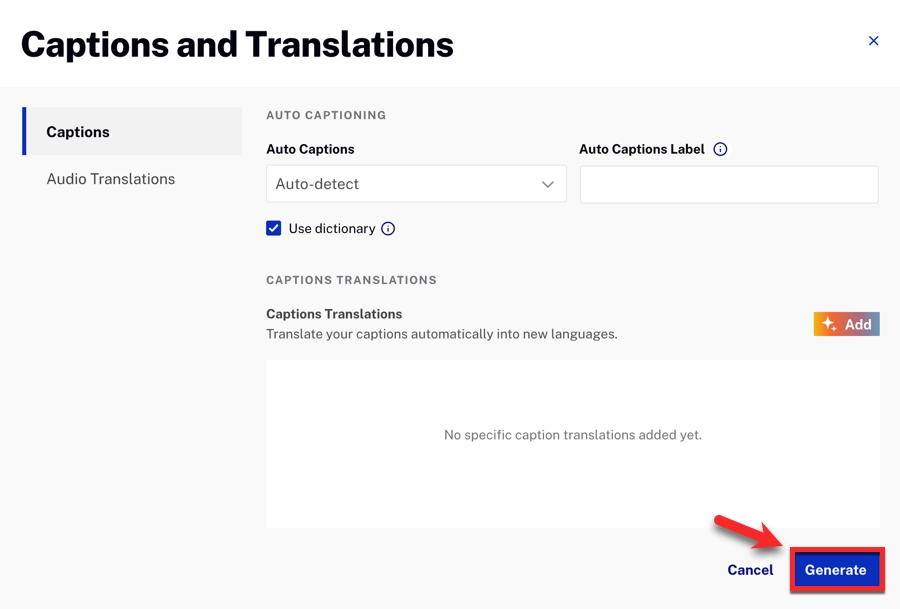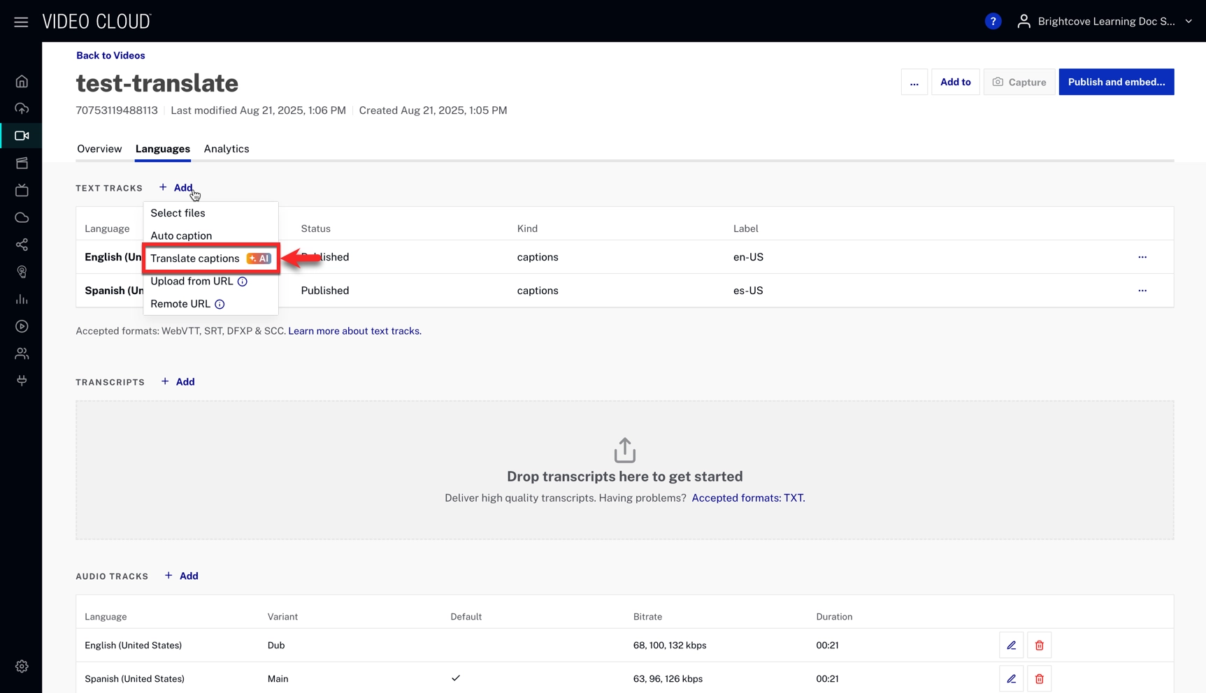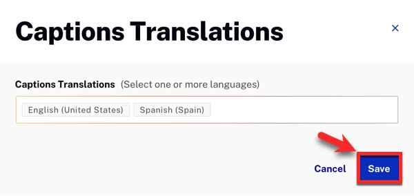 - Complete the upload. Auto-captions are generated, and then translated into the languages you selected.