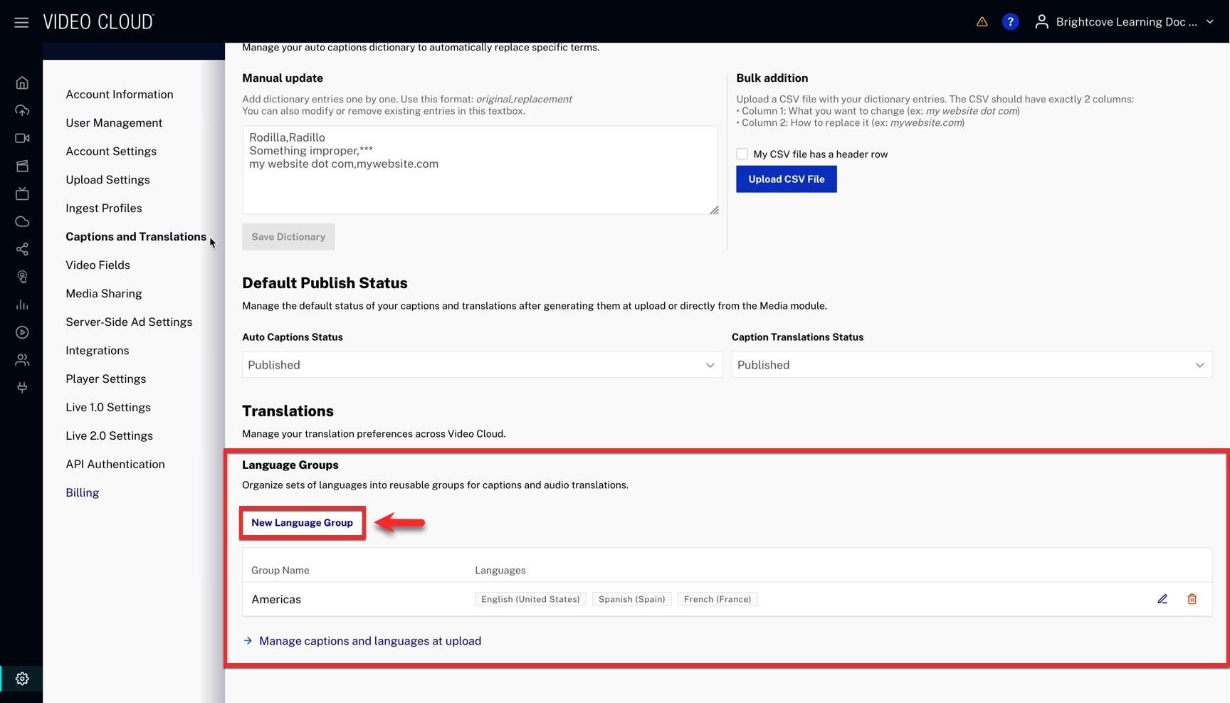 With language groups, you can organize sets of languages into reusable groups for captions and audio translations.