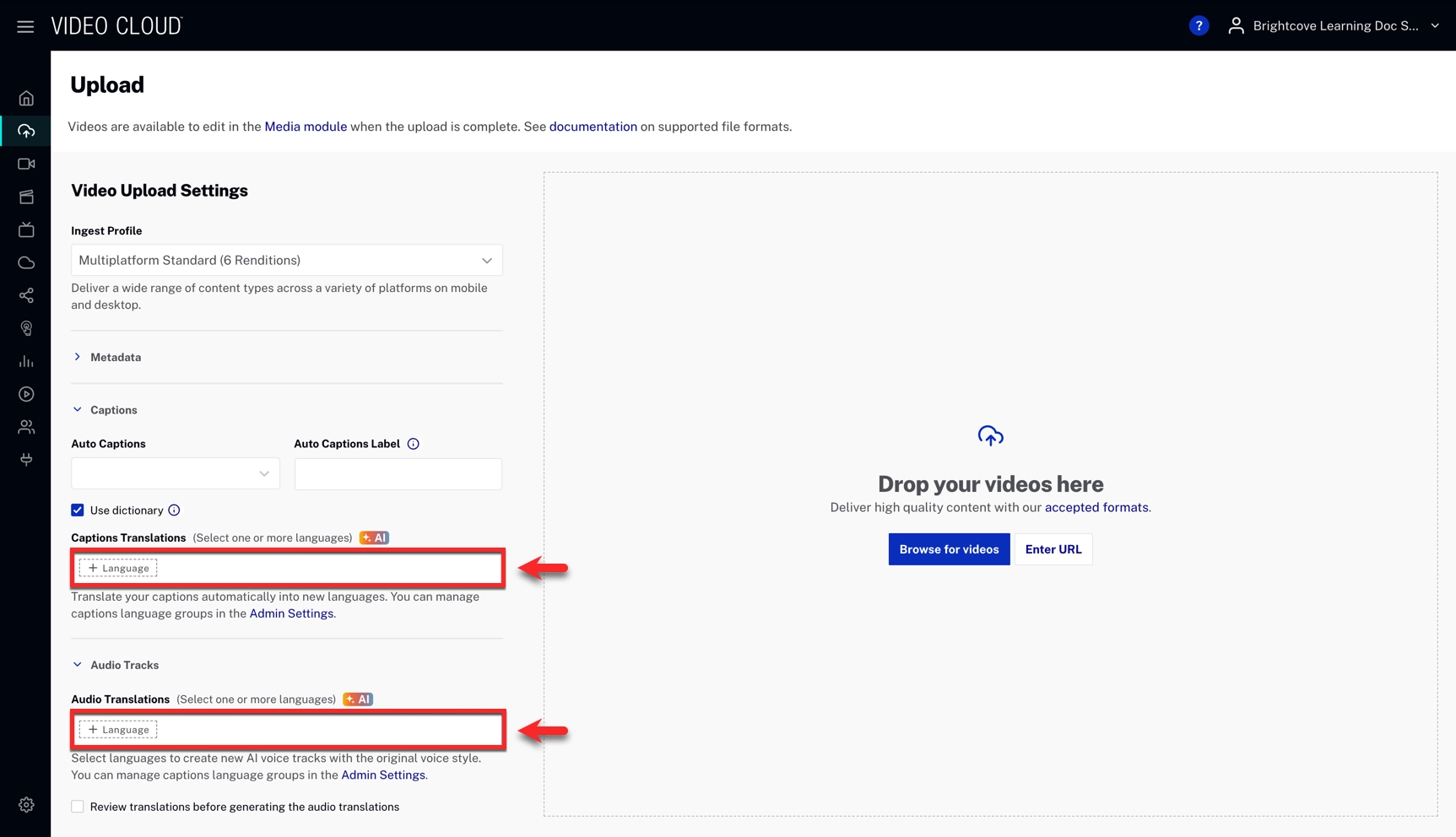 Manage UI-only ingestion preferences for captions and translations. These settings prefill fields in Video Cloud UI only; API clients can still send any values they need.
