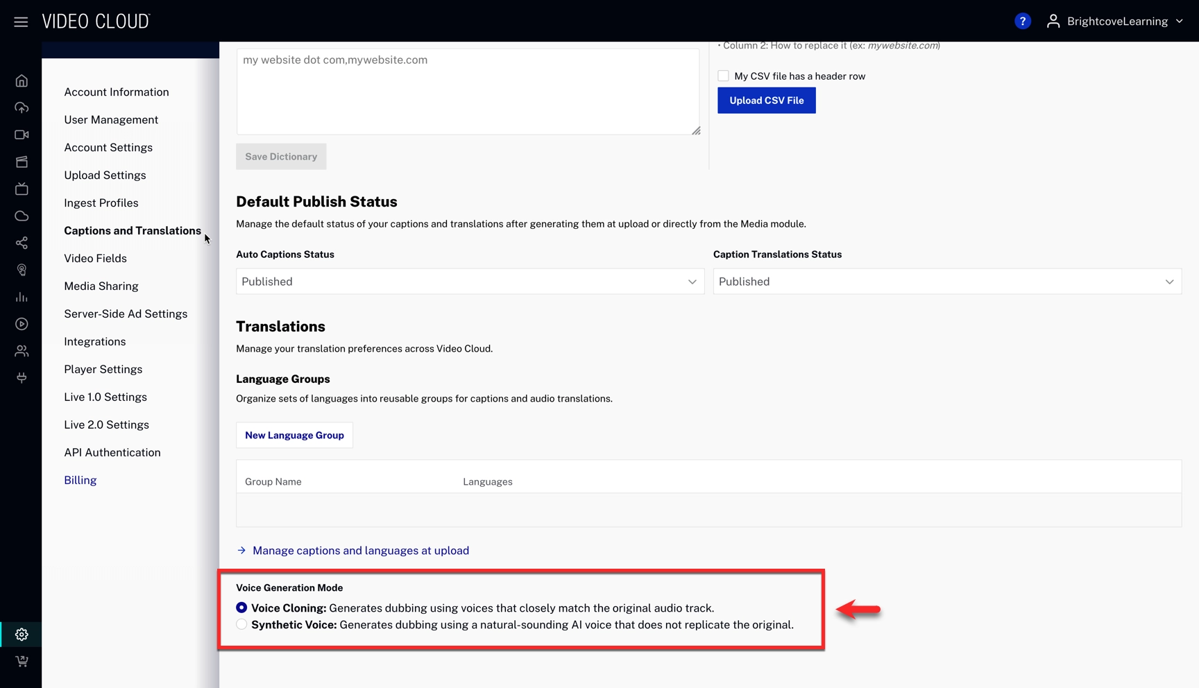 - Select Captions and Translations and scroll down to the Voice Generation Mode section.