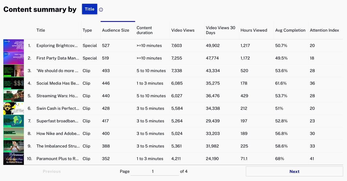: See the performance of individual content titles based on minutes viewed or engaged views.