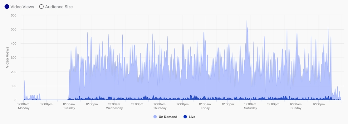 Switch between Video Views and Audience Size to visualize the total number of views your content received or the size of the audience engaging with that content.