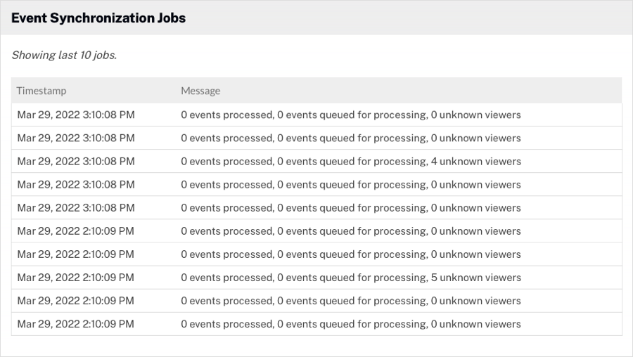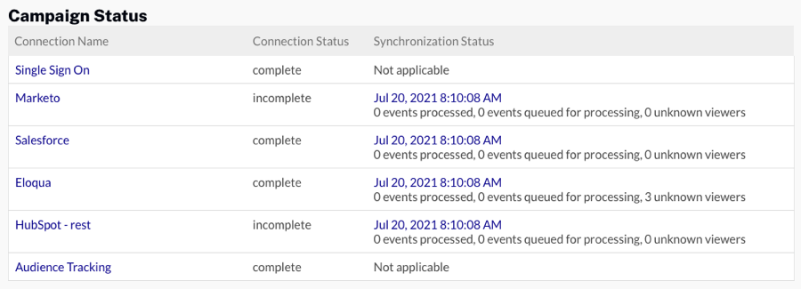 The Synchronization Activity option displays the last 10 jobs that were synchronized from Campaign to a marketing automation platform. Synchronization runs on an hourly basis. Select a connection and then click the Test Sync button to run a synchronization. This is helpful when testing new integrations to avoid having to wait to see if event data is being sent to your marketing automation platform. Test Sync can be executed once every 5 minutes up to 10 times per hour.