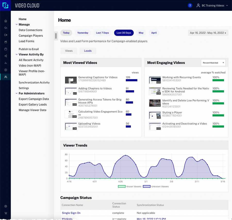 The Campaign module is used to track video engagement data for videos that are viewed inside of a Campaign-enabled Brightcove Player. Viewing data is stored in Video Cloud and can optionally be synchronized to popular marketing automation platforms such as Eloqua, Marketo, HubSpot and Salesforce.