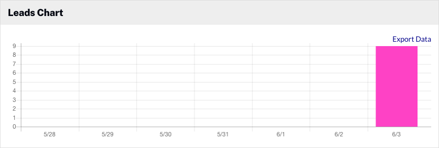 The Leads Chart displays the number of submitted lead forms by day for the selected time period. Hovering over the graph will display the actual data points.