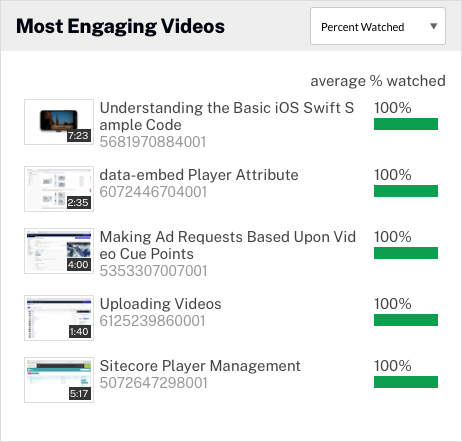 The Most Engaging Videos chart displays the most engaging videos in Campaign-enabled players for the selected time period. Engagement is the average percent watched. For details on how we calculate video engagement, watch the training video Calculating Video Engagement Score.
