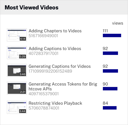 The Most Viewed Videos chart displays the most viewed videos in Campaign-enabled players for the selected time period.