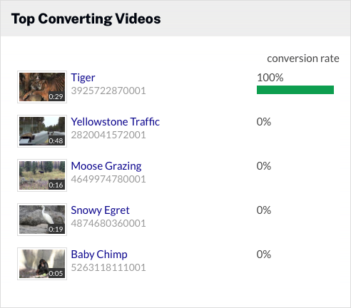 The Top Converting Videos chart displays the videos with the highest conversion rate. The conversion rate is calculated by dividing the number of submitted lead forms divided by video impressions.