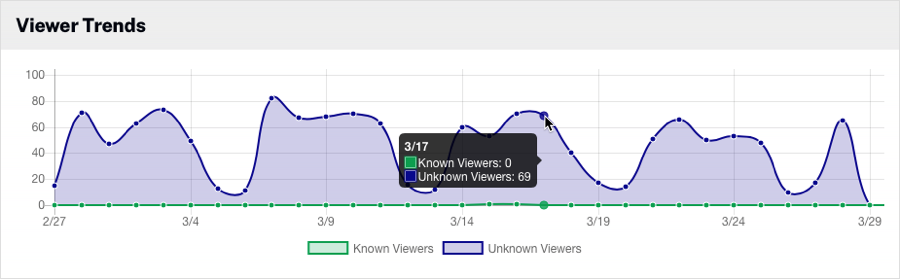 The Viewer Trends chart displays video views over time for the selected time period. Views from both known and anonymous viewers are displayed. Hovering over the graph will display the actual data points.