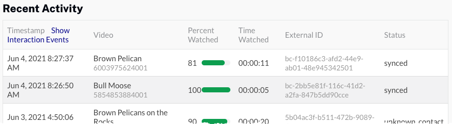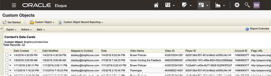 - Click on the contact to open up the details page. A list of all video view records for the contact will be displayed. This is the video view data delivered from Campaign to Eloqua. Fields such as Video Name, Video ID, Player ID, Time Watched, Percent Viewed and more are included.