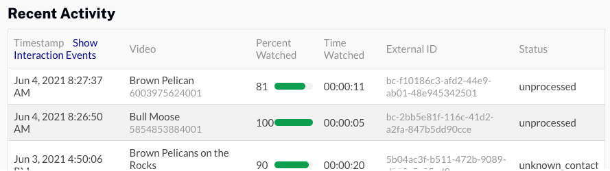 - Confirm that there is an event with a recent timestamp showing the name of the video that was just watched. The event status should be unprocessed. This indicates that Campaign has captured the view but has not yet attempted to sync it to Eloqua.