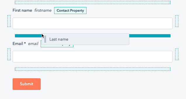 - The left side of the page contains a list of fields that can be added to the form. Drag and drop the First name and Last name fields that you want on the form to the right side of the page.