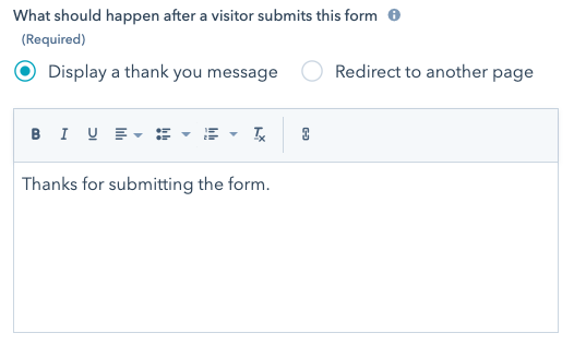 - For What should happen after a visitor submits this form, click Display a thank you message. Keep the default message as it will never be displayed.