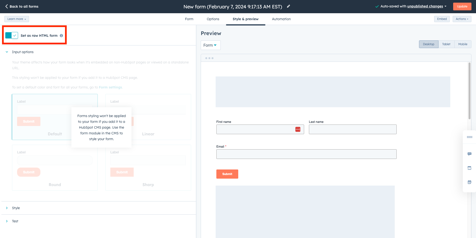 - Click the Style & preview link at the top of the page. By default, a Desktop preview will appear.