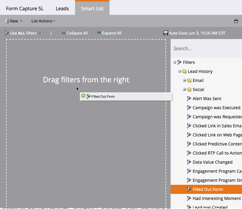 - In the list of Filters on the right side of the page, locate the Filled Out Form filter. Click and drag the filter to the page.