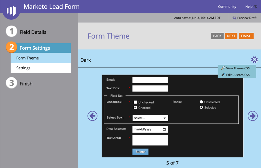 - Click the arrow icons to select a form theme. The form theme controls the styling of the form. Click Preview Draft to see a preview of the form. In this example, the Dark theme was selected.