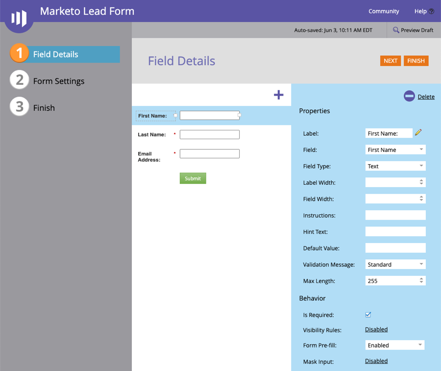 - The form designer will open. By default, First Name, Last Name and Email Address fields will be on the form. Edit the field properties and behavior as needed. Click NEXT.