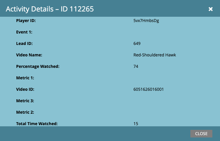 - Double-click a row to display the fields Campaign has populated.. The popup will display the video viewing data delivered from Campaign to Marketo such as Player ID, Video ID, Video Name, Percentage Watched and other fields.