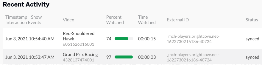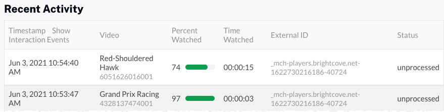 - Confirm that there is an event with a recent timestamp showing the name of the video that was just watched. The event status should be unprocessed. This indicates that Campaign has captured the view but has not yet attempted to sync it to Marketo.