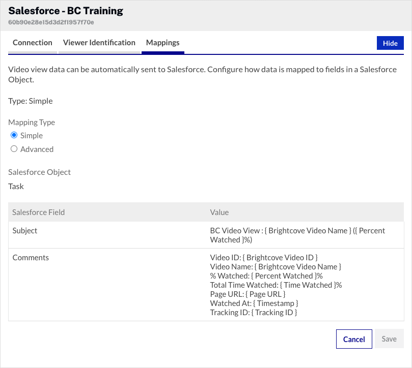 Data mapping determines how video data is mapped to fields in a Salesforce object. By default, the integration will be configured using Simple mapping which maps some video data to the Task object in Salesforce.