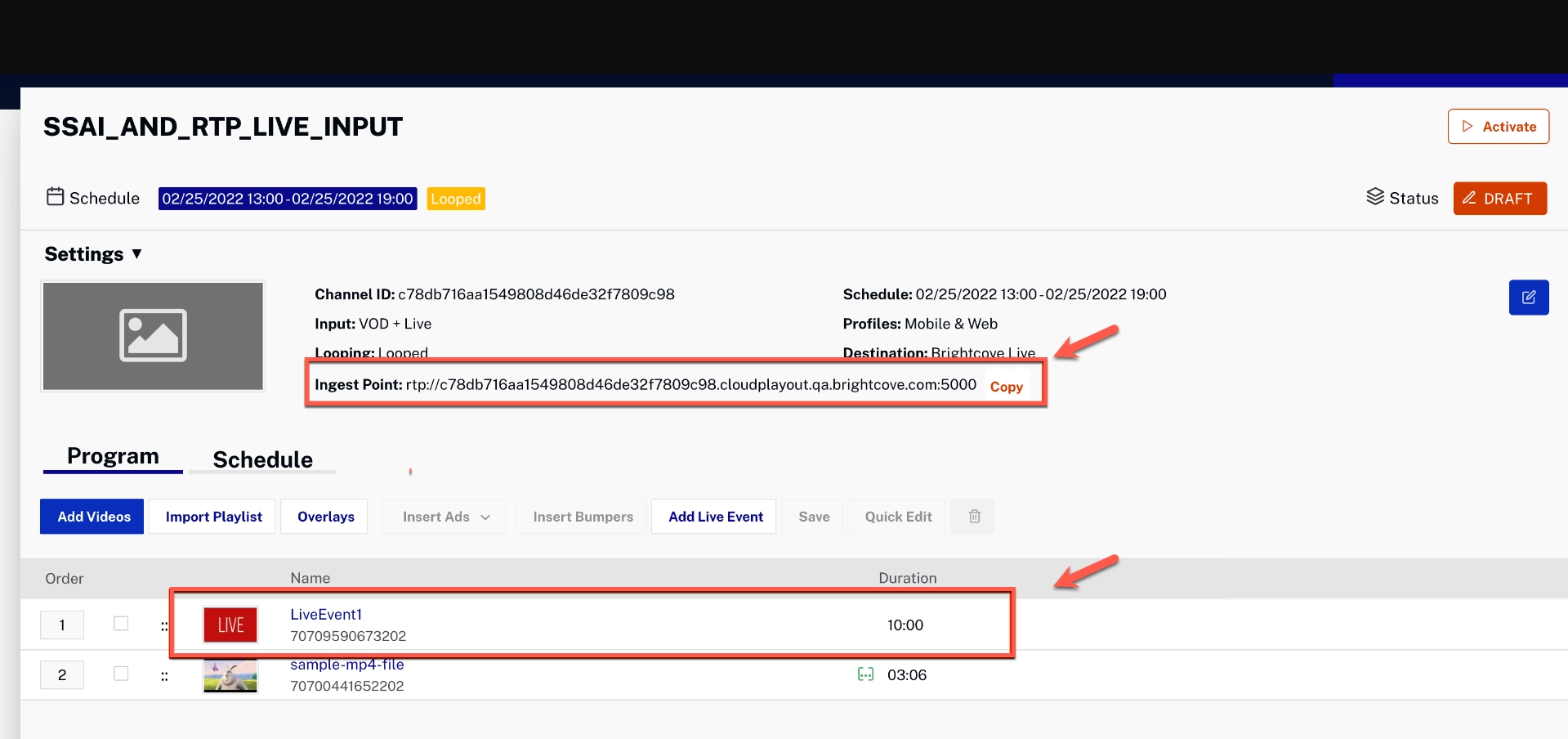 - Cloud Playout SSAI channels accept RTP PUSH as an input source feed.