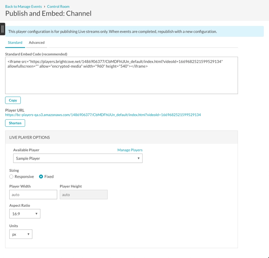- Click the Player URL to preview the event in a browser or copy the appropriate embed code to use.